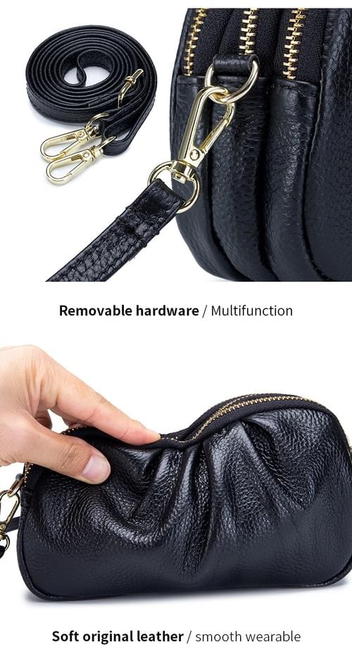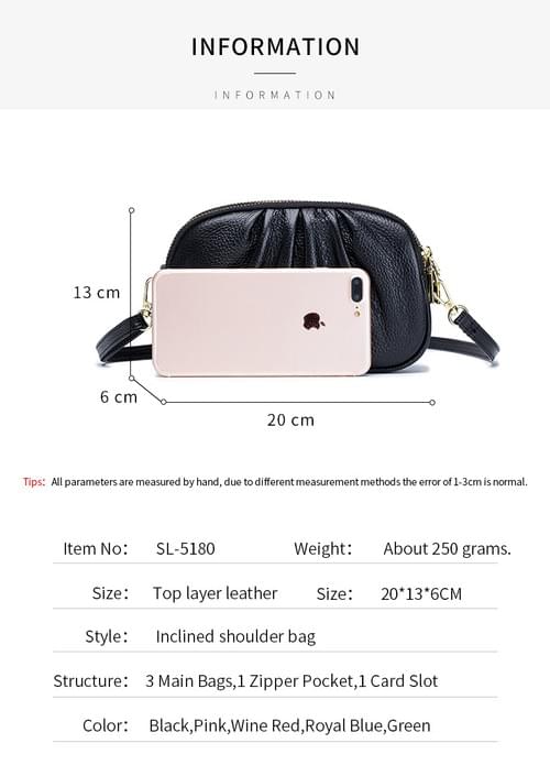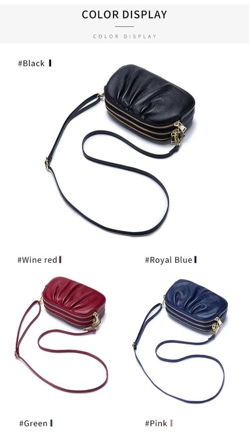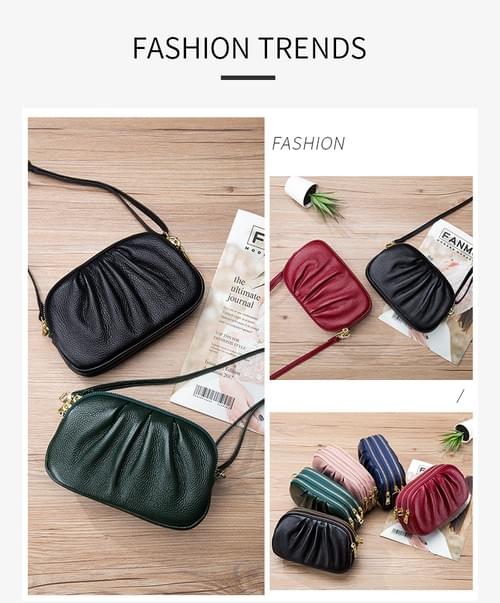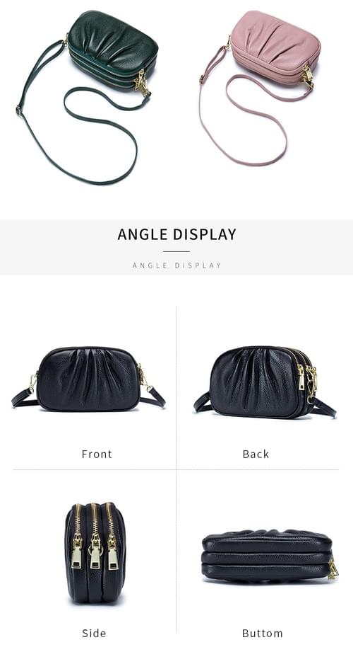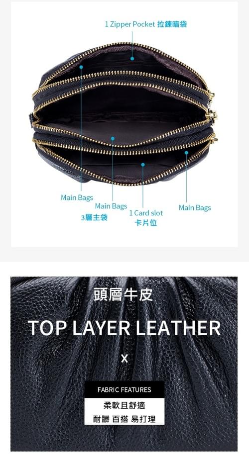 高質感牛皮三層拉鍊皺褶單肩斜揹小包